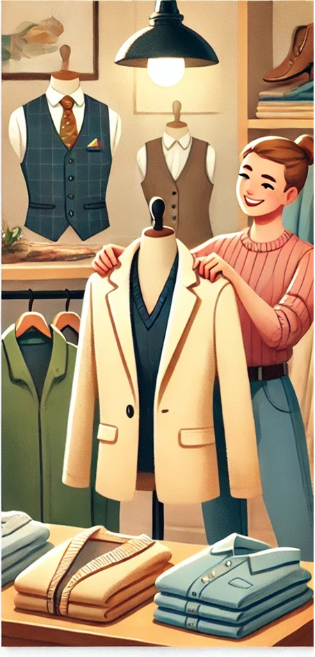 B: Sure, we have this beige jacket or this blue one. Would you like to try them on?